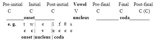 If we have a look at the structural properties of syllable we observe that syllable consists of a central peak of sonority and the consonants that cluster around this central peak. According to one of the oldest conceptions the syllable consists of a vowel, surrounded by consonants. If the function of the vowel in the syllable is to serve as its nucleus or peak, then the function of the consonants is to be the margins of the syllable. Syllables have the following formal internal structure: onset (initial consonant cluster), nucleus and coda (final consonant cluster) and the structural formula for the English syllable can be drawn as: