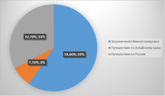 На вопрос «Куда бы вы поехали?» почти 60 % опрашиваемых выбрали заграничную стажировку (рис.1). Такой факт можно расценить как стремление молодежи путешествовать и познавать мир, так и то, что отечественный туризм и сервис нужно развивать.