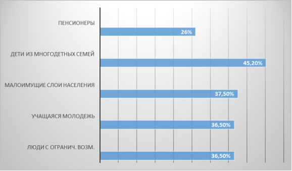 Чуть больше 45 % посчитали, что в первую очередь нужно давать льготы детям из многодетных семей, вторыми по списку стали-малоимущие слои населения, одинаковое количество голосов набрали учащаяся молодежь и люди с ограниченными возможностями, на последнем месте-пенсионеры.