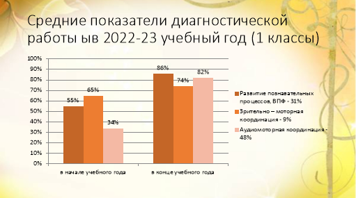 На конец года развитие познавательных процессов, ВПФ повысилось на 31 %, зрительно-моторная координация на 9 %, аудиомоторная координация на 48 %. Также через наблюдение мы видим развитие произвольной сферы, работоспособности.