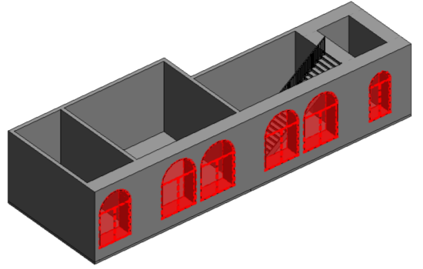 Ниже представлены картинки трех стадий. На рисунке 1 представлена существующая версия объекта. Как и во многих зданиях конца XIX века окна зданий были арочного типа, объяснить это можно тем, что применение железобетонных перемычек над проемами нашло распространение уже в XX веке. Рисунок 2 показывает стадию сноса, демонтируемых конструкций, в основном это двери и окна. Рисунок 3 отображает вновь создаваемые перегородки из гипсокартонных листов по стальному каркасу типа Knauf и заполнение оконных и дверных проемов.