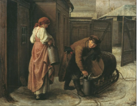 Если в русской деревне почти в каждом дворе был выкопан свой колодец, то в городе с водой было сложно. Вода в реках и прудах чаще всего была непригодна для питья, поэтому чистую воду приходилось горожанам привозить. Доставкой занимался водовоз. Чтобы им стать, нужно было иметь запряженную лошадьми телегу или двухколесную повозку и большую бочку. В крупных городах эта профессия сохранялась до начала XX века, пока не появился централизованный водопровод. Реконструкция картины на рис. 10.