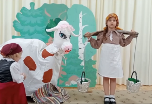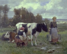 Следующим произведением стало «Доярки в поле» Жюльена Дюпре. (Рис. 3). Дети узнали, что доярка ухаживает за коровами, доит их, кормит, содержит помещения в порядке, заботится о том, чтобы люди получали свежее и полезное молоко. Труд доярки раньше был очень тяжелым. Каждое утро и вечер она надевала халат, косынку и резиновые сапоги, это специальная одежда, и шла доить коров.