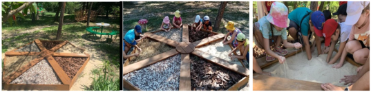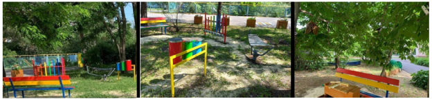 — Наполнение: на данном участке расположена модульная конструкция, состоящая из 6 модулей с природными наполнителями: сено, шишки сосновые и еловые, мраморная крошка, песок, галька, древесная кора