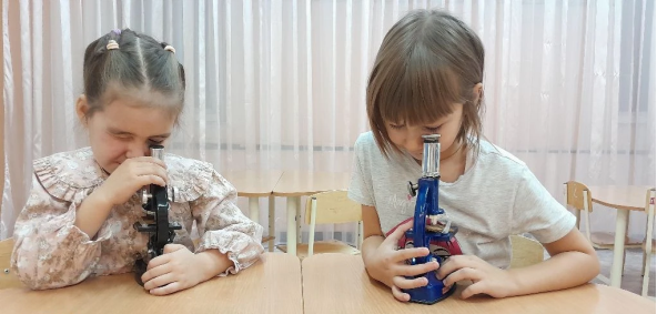 Педагог делить детей на подгруппы у разных столов и предлагает под лупой и микроскопом рассмотреть кору деревьев.