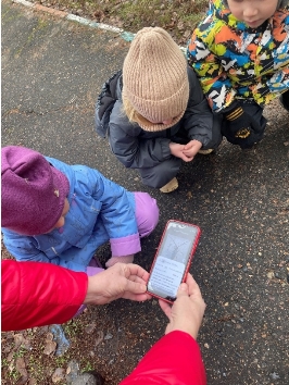 Педагог вместе с детьми передвигаются по территории группового участка рядом с деревьями в поисках насекомых, используя «умную» камеру.