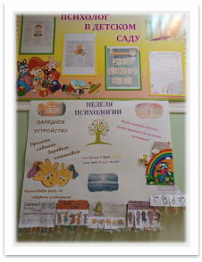 На подготовительном этапе разрабатываются и утверждаются локальные акты, состав рабочей группы педагогов. Рабочая группа педагогов составляет план мероприятий Недели психологии. Для привлечения большего количества участников размещается анонс мероприятий на информационных стендах, странице в ВК и на сайте образовательной организации. Педагоги предварительно подготавливают необходимый раздаточный и демонстрационный материал, конспекты мероприятий и оформляют образовательное пространство. Пример оформления стенда «Психолог в детском саду» возле кабинета педагога-психолога представлен на рисунке 1 и рисунке 2.