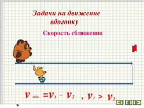 При движении вдогонку, обязательно показать график, мы видим, что тот кто догоняет, идет с большей скоростью, поэтому встреча произойдет, а если встреча произойдет, то значит скорость сближения. Но, это скорость мы будем искать вычитанием, из большей скорости будем вычитать меньшую, это очень важно прям «разжевать», потому что все равно очень часто бывает такое у учеников, что вроде и говорят правильно и форму запишут правильно. Но как надо будет решать задачу они будут складывать две скорости, а не вычитать из большей меньшую. Поэтому четко проговариваем формулу скорости сближения при данном типе движения, просим отдельных учеников повторить тоже самое, после чего переходим к последнему типу движения.