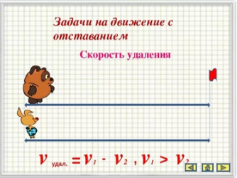 Движение с отставанием тоже вызывает определенные трудности, так как очень важно пояснить ученикам то. Что встречи при этом виде движения не произойдет, так как первым идет тот, у кого скорость больше, а за ним движется объект с меньшей скоростью, поэтому он никогда не догонит впереди идущего. Если встреча не произойдет, значит скорость удаления, которая тоже ищется знаком минус, опять же вычитать будем из большей скорости меньшую.