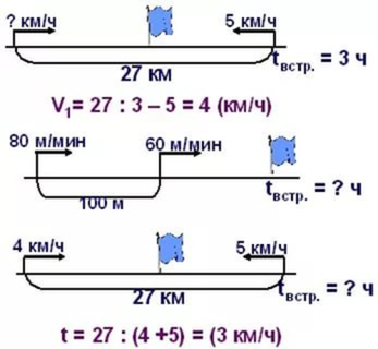 После того, когда вспомнили виды движения и формулы нахождения скоростей сближения и удаления, предложим ученикам, используя только схемы, решить задачи.
