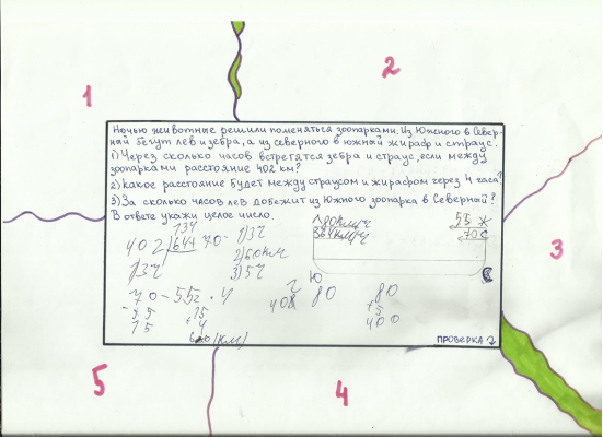 После того, как вся команда решила свои индивидуальные задачки, раздаем им «поле игровое», в центре которого написана еще одна задачка, которую им нужно решить вместе, а по бокам этого «Игрового поля» ученики приклеивают свои решенные задачки (у каждой задачки есть номер).