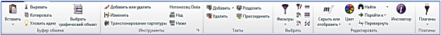 Above is a series of Sibelius tapes. Each named section is displayed as a ribbon and consists of its own set of commands.