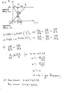 Осуществляет знакомство с новым методом. Ребята, хотелось бы сказать, что, во-первых, применение геометрического метода может поспособствовать разрушить миф о том, что учебные курсы алгебры и геометрии совершенно независимые. Во-вторых, этот метод наиболее красивый. осталось проверить его рациональность. Геометрический метод с использованием подобия треугольников особенно полезен для решения задач, связанных со встречным движением, движением вдогонку. В этих задачах часто возникают пропорциональности, которые можно элегантно решить через подобие треугольников на графиках. Построение графика (обычно зависимости x(t) — положение от времени): Ось X: Время (t). Ось Y: Положение (x) — расстояние. Изобразите траектории движения каждого объекта как прямые линии на графике x(t). Если движение равномерное (скорость постоянна), это будут прямые линии. 2. Определение ключевых точек и линий: Точки начала движения каждого объекта (t₁, x₁) Точки встречи (tₒ, xₒ) — точка, где линии графиков объектов пересекаются. Продолжите линии движения до пересечения с осями координат (x и t). Это может помочь создать подобные треугольники. Обозначьте все известные расстояния, времена и скорости на графике. Подчеркиваю, что чем больше абсолютное значение углового коэффициента (т. е., чем круче прямая), тем больше скорость тела. Горизонтальная линия означает, что тело не движется (скорость равна нулю). При этом скорость равна тангенсу угла наклона графика "расстояние-время" к оси времени (так как скорость это и есть отношение расстояния ко времени). 3. Поиск подобных треугольников: Ищите пары треугольников, которые имеют одинаковые углы. Обычно это достигается за счет вертикальных углов, параллельных прямых (соответствующие или внутренние накрест лежащие углы равны) и прямого угла (если линии перпендикулярны осям). Важно правильно определить, какие стороны треугольников являются соответственными (то есть соответствуют друг другу в подобных треугольниках). Таким образом, решим задачу геометрически: построим две оси: горизонтальную (времени t) и вертикальную (положение пути х). Пусть эти оси пересекаются в точке «А» — начало движение первого тела. На луче AS отметим точку «Б» — начало движение второго тела. Отметим точку О — их место встречи (учитывая то, что 1ое тело после встречи ехало дольше). Проведем через точку О прямые до пересечения с осями x и t, тогда получили отрезки AS — время движения первого тела и БR — время движения второго тела. Проведем через т. О HM перп. AS и перп. БR, отражающую время, через которое произошла встреча, следовательно, треугольники подобны (по двум равным углам, одни равны как углы при перпендикулярах, а другие как вертикальные), значит треуг. HOБ ~ треуг. MOS и треуг. HOR ~ треуг. MOA (по 1 приз.). Далее он составляет соотношения и из полученных уравнений получает искомое, отмечая что отрезки времени до встречи равны (например, по «х») Время, отведенное на эту работу ~3,25 минут (с учетом объяснения/проговаривания).