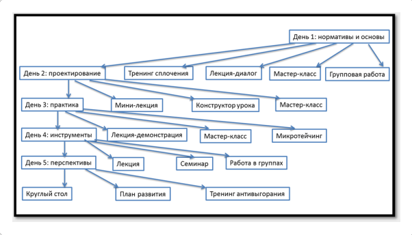 День 5. Тема «Итоги. Ресурсы. План на старт». Проводится с целью подведения итогов, формирования плана развития и оказания поддержки начинающим педагогам. Виды занятий: круглый стол, индивидуальная работа, тренинг, церемония закрытия, подведение итогов.Врезультате педагоги уходят с индивидуальным планом развития и системой поддержки.