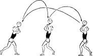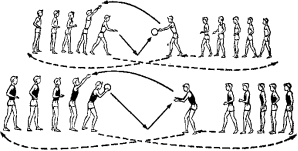 Становятся на заданное расстояние. Мяч над собой на 1,5–2 метра. Передача партнерам по дугообразной траектории |