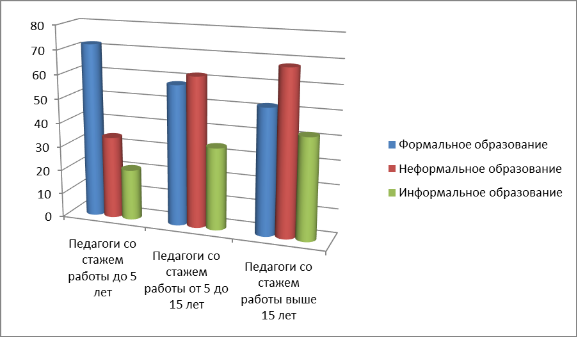 Полученные, в результате анкетирования, данные показывают, что, чем больше педагогический опыт учителя, тем он активнее и шире использует для своего индивидуального развития различные формы неформального и информального образования. Это можно связать как с постоянным стремлением к саморазвитию, самосовершенствованию и адаптации к потребностям современного общества.