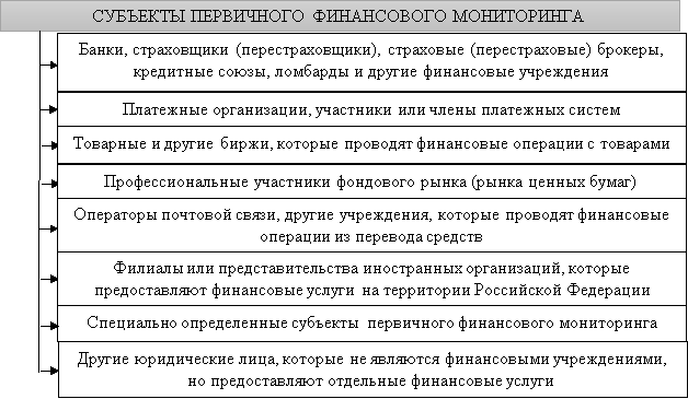 Система финансового мониторинга состоит из первичного и государственного уровней. Субъекты первичного финансового мониторинга изображена на рис. 1.
