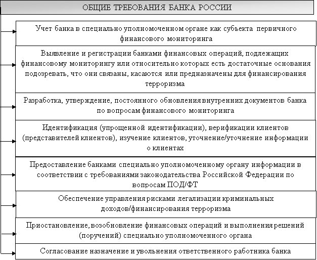 С целью предотвращения использования банковской системы для легализации (отмывания) доходов, полученных преступным путем, или финансирования терроризма Банком России был утверждён ряд нормативных актов по вопросам противодействия этому явлению. В этих положениях выделены общие требования к банкам (рис. 3)