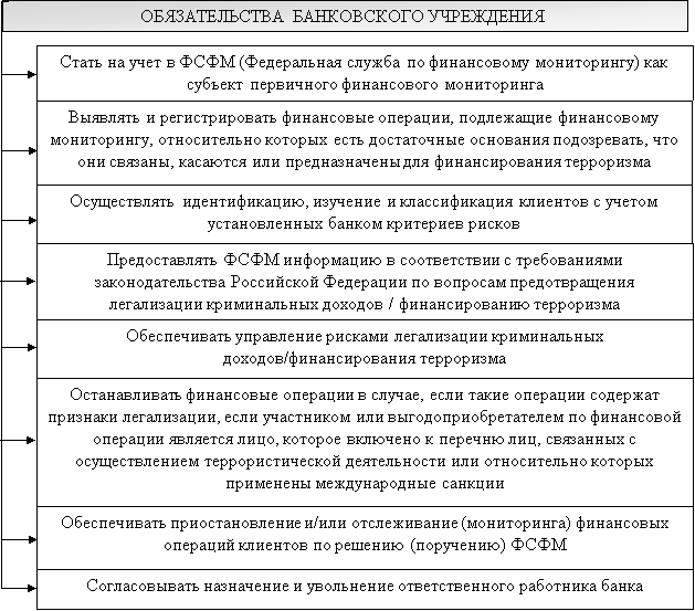 На уровне банковского учреждения устанавливаются правила, разрабатываются программы проведения финансового мониторинга и назначаются работники, ответственные за его проведение. Банковские учреждения имеют определенные обязательства (рис. 4).
