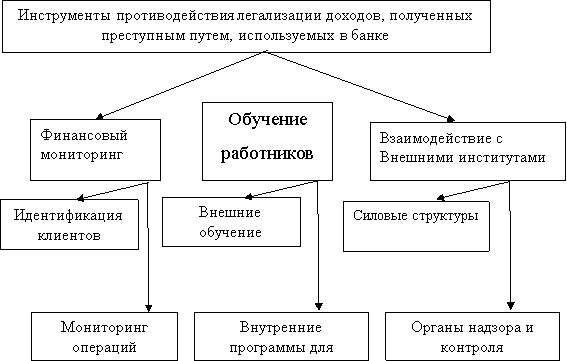 Банки играют ключевую роль в борьбе с отмыванием денег. Эта роль может быть либо активной, когда банк создает условия для проведения сомнительных операций или же пассивной, когда банк является лишь ключевым звеном он играет лишь роль ключевого звена в проведении финансовой операции. Инструменты противодействия легализации доходов, полученных преступным путем, в банке имеют структуру, изображённую на рис. 5.