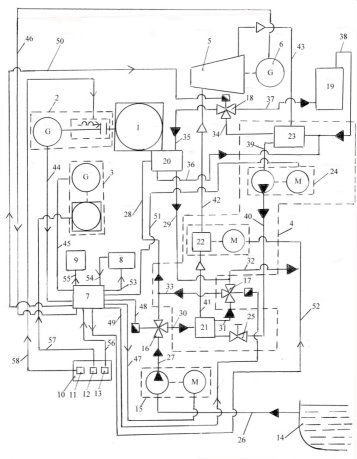 Рис. 1. Схема энергосберегающей установки: 1 — главный судовой дизель; 2 — валогенератор; 3.-. дизель-генератор; 4.- тепловой насос; 5 — паровая турбина; 6 — генератор; 7 — главный распределительный щит; 8 — аккумуляторные батареи; 9 — судовой потребитель электроэнергии; 10 — пульт управления; переключатели: 11 — валогенератора, 12 — дизель-генератора, 13 — теплового насоса; 14 — клинкет, 15 — электрический насос; 16, 17, 18 — электронные трехходовые вентили (3ХВ); 19 — потребитель тепловой энергии в служебных и жилых помещениях, 20 — потребитель тепловой энергии в рабочих системах дизеля; элементы теплового насоса:21 — испаритель, 22 — компрессор, 23 — конденсатор, 24 — электрический насос, 25 — дроссель; 26, 27, 28, 29, 30, 31, 32, 33 — каналы охлаждающей забортной воды; 34. 35, 36, 37, 38 — каналы теплоносителя; 39, 40, 41, 42, 43 — каналы хладагента; 44, 45, 46 — каналы выработанной электроэнергии; 47, 48, 49, 50, 51, 52, 53, 54, 55, 56, 57, 58. — каналы подачи электроэнергии