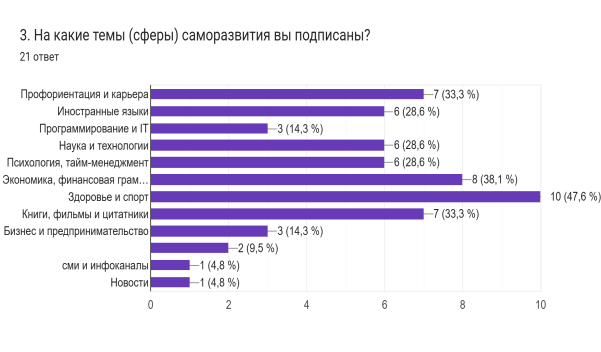 Популярные темы: «Здоровье и спорт» (47,6 %), а также «Книги и фильмы» (47,6 %), также высок интерес к психологии, финансам и профориентации.