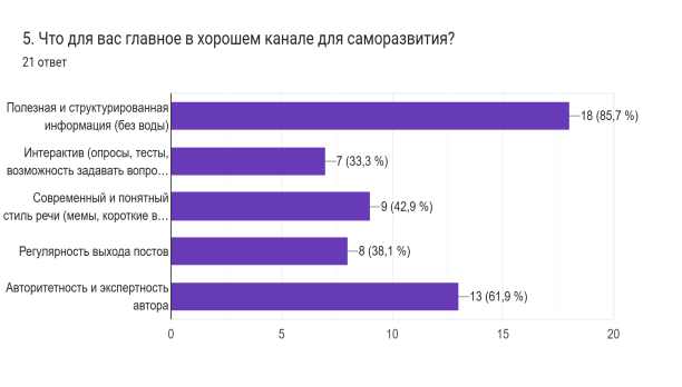 Критерии выбора: для 85,7 % учащихся критически важны полезность и структурированность информации. «Идеальный» канал в представлении подростков — это ресурс с экспертным контентом и понятной подачей.