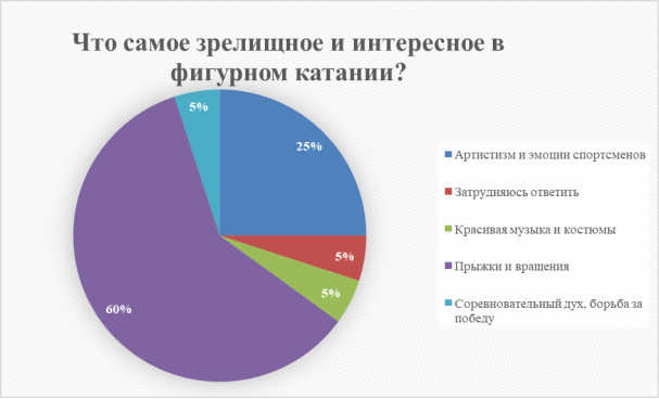 Результаты меня удивили и порадовали. Оказалось, что большинство опрошенных любят фигурное катание за прыжки и вращения. А самыми известным фигуристами являются Навка, Костомаров, Плющенко, Ягудин.