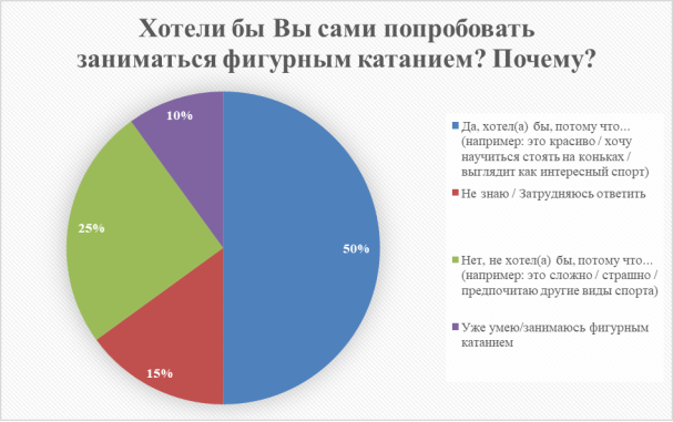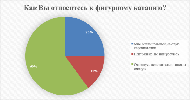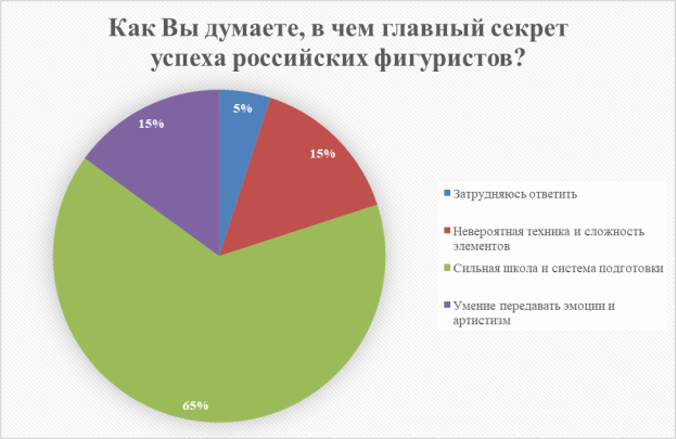 Проведенное анкетирование показало, что фигурное катание вызывает интерес у современной молодежи. Большинство опрошенных положительно относятся к этому виду спорта, хотели бы попробовать заниматься им, а главным секретом успеха российских фигуристов считают сильную школу и систему подготовки.