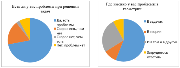 Перед тем как начать работу по созданию тренажера, мы решили узнать, действительно ли у школьников существуют проблемы с пониманием геометрии. Для этого мы провели опрос. В опросе приняли участие 100 обучающихся лицея из 7, 8, 9, 10-ых классов. Из опроса видно, что большинство трудностей возникают у ребят при самостоятельном решении геометрических задач. Работая над проектом, мы увидели, как часто в реальной жизни можно применить теорему Пифагора. Возникла идея создать компьютерный тренажер по решению практикоориентированных задач с использованием данной теоремы.
