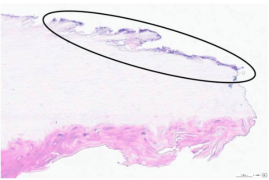 «Ноготь без покрытия». Верхние отделы эпидермиса с наличием клеток в состоянии апоптоза с гиперхромией ядер и их деформированием (естественный процесс «созревания»).
