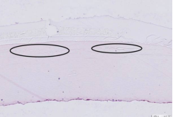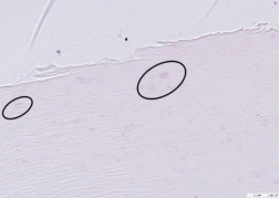 В структуре ногтевой пластины определяются вкрапления материала покрытия (выделены на изображении).