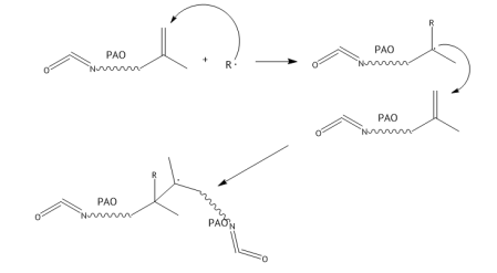 Красными кружками я выделила -NCO группу и двойную связь акриловой кислоты, все что посередине обозначим PAO. Для роста цепи возможно несколько направлений, участвовать будут все функциональные связи, например: