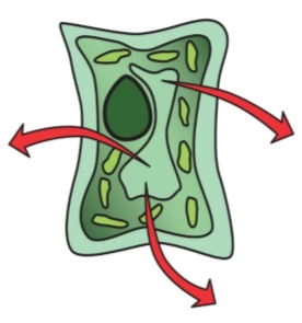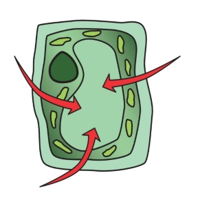 Рис. 1. Гипотонический раствор. Вода поступает в клетку, вакуоли увеличиваются и давят на клеточную стенку |
