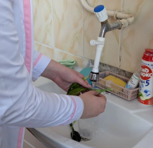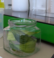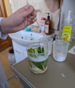 - Дезинфицировать растение, инструменты и емкость для консервации (растение и приспособления для консервации и в разных растворах) в мыльном дезинфицирующем растворе (Приложение 3, фото 3–4); стерилизовать ёмкость для консервации в кипящем оксидане.