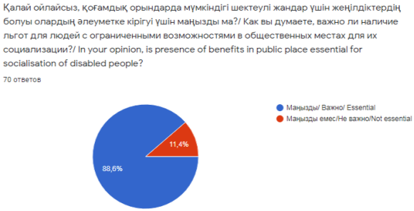 Answers related to the question: “How do disabled people evaluate their opportunity to socialize in Kazakhstan?” There is a correlation between 3 research tools responses. They suggest that opportunities for socialisation are better in large cities in comparison with smaller towns. Primary research reveals that disabled people are not fully satisfied with opportunities for their socialization.