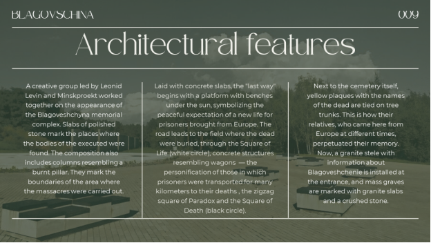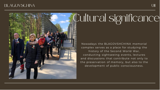 Nowadays the Blagovshchina memorial complex serves as a place for studying the history of the Second World War, conducting sightseeing events, lectures and discussions that contribute not only to the preservation of memory, but also to the development of public consciousness. [4, с. 16]