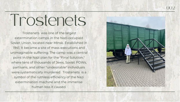 I should mention that Trostenets was one of the largest extermination camps in the Nazi-occupied Soviet Union. It was located near Minsk (at present it is a part of the city). The camp appeared in autumn in 1941, and very soon it became a site of mass executions and unimaginable suffering. The camp was a central point in the Nazi plan for the «Final Solution», where tens of thousands of Jews, Soviet POWs, partisans, and other «undesirable» individuals were systematically murdered. Trostenets is a symbol of the ruthless efficiency of the Nazi and it is a symbol of the immense human loss it caused.