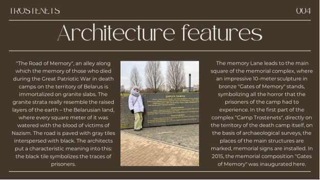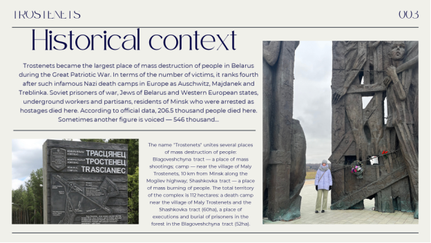 Taking into account these results I have come to conclusion — it’s vital to highlight the significance of preserving the memory of the victims of Trostenets and emphasize the importance of memorial sites and educational programs in ensuring that future generations remember and learn from these tragic events. So I have decided to work out a guide with all necessary information about this tragic place and with the help of guide to hold an excursion or even a tour “Memorial complexes: Trostenets, Blagovschina, Shashkovka” (Supplement 3).