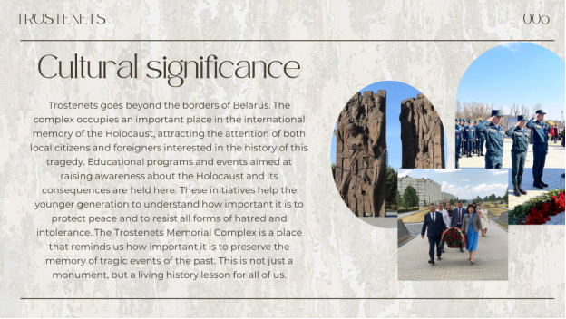 The Trostenets Memorial Complex is part of Belarusian cultural heritage and it encourages reflection on peace and tolerance. Understanding the events that took place at Trostenets provides insight into impact of World War II on Belarus and the intertwined histories of various ethnic and national groups. The site serves as a somber reminder of the necessity of protecting human rights against hatred. It emphasizes the importance of vigilance in preventing similar antrocities in the future.