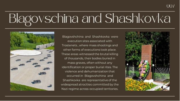 We should mention Blagovshchina and Shashkovka, as well. They were execution sites associated with Trostenets, where mass shootings and other forms of executions took place. These areas witnessed the humanless killing of thousands, their bodies buried in mass graves, often without any identification or proper burial rites. The violence and dehumanization that happened there are typical of the widespread atrocities committed by the Nazi regime all over occupied territories.
