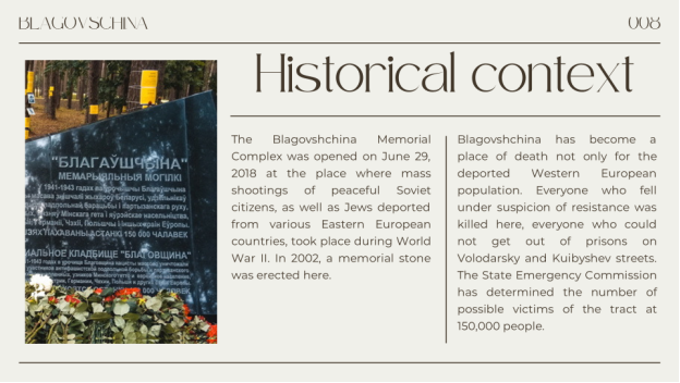 It’s obvious that the history of Trostenets, Blagovshchina, and Shashkovka represents one of the darkest and most tragic chapters in the history of Belarus during the Nazi occupation in World War II. These places are the unforgotten symbols of the horrors and atrocities committed during the Holocaust, they can be regarded as a grim reminder of human cruelty and the devastating impact of genocide.