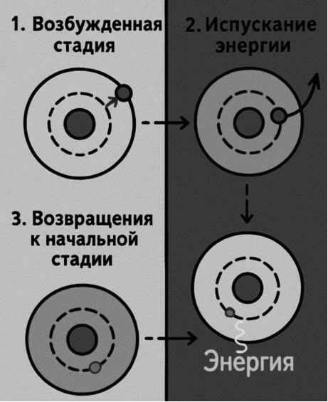 Если заглянуть вглубь материи — на уровень атомов, — можно увидеть следующую картину. Вокруг ядра атома вращаются электроны, занимая определенные орбитали. В стабильном состоянии атом не излучает энергию. Однако при попадании в него другой частицы атом переходит в возбужденное состояние: электрон перемещается на более удаленную от ядра орбиталь. Стремясь вернуться в исходное состояние, электрон опускается на прежнюю орбиту и при этом выделяет энергию — именно она и воспринимается нами как свет.