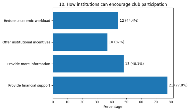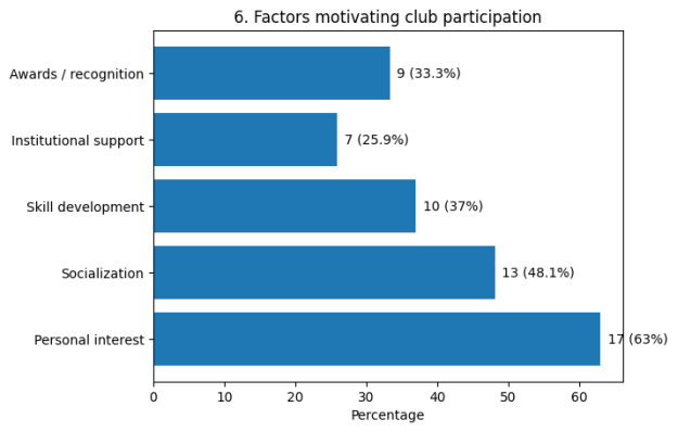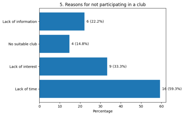 While 63 % of respondents stated that they currently participate in at least one club, a significant minority (37 %) reported no involvement. This suggests that availability alone does not ensure participation.