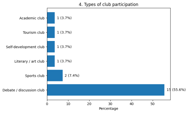 Discussion and debate clubs were the most commonly attended, selected by 55.6 % of participants. All other club types individually attracted fewer than 10 % of respondents, indicating limited diversity in active participation.