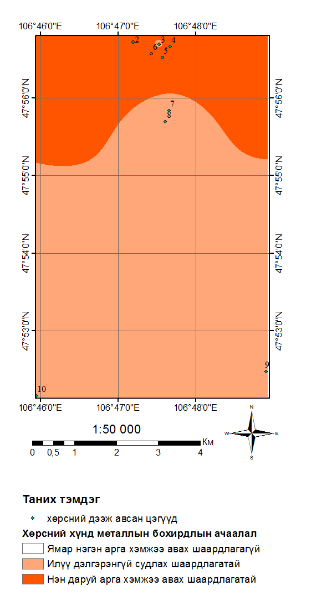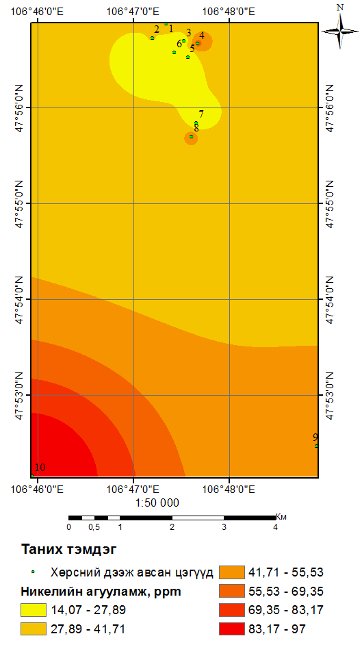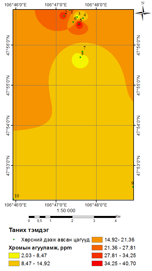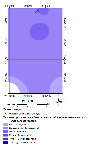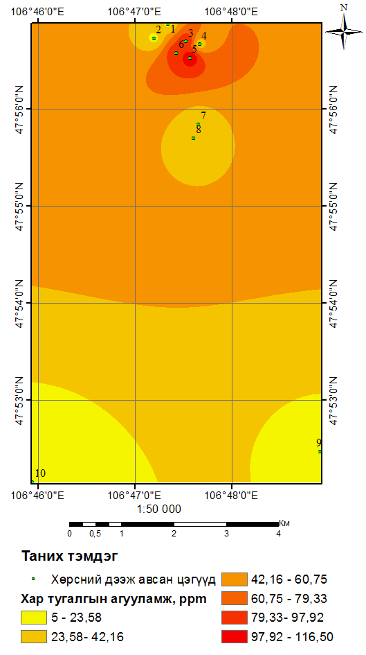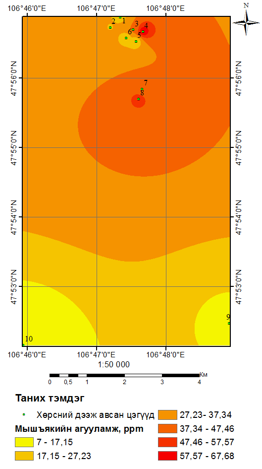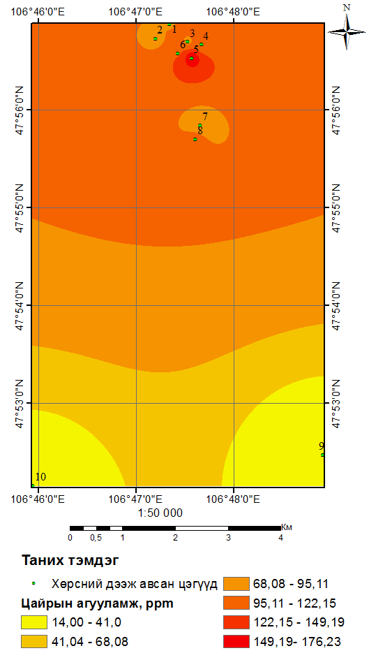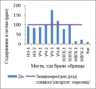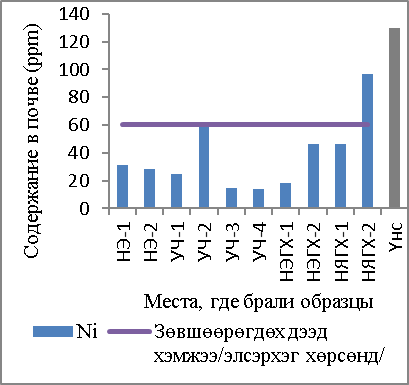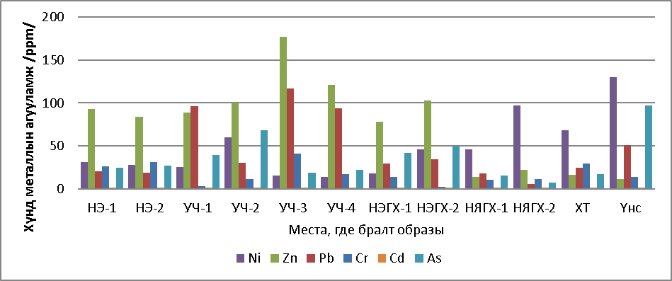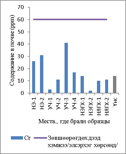 В результате исследования обнаружено, что почвы НЭ-1 и УЧ-1,2,3 в большой степени загрязнены тяжелыми металлами. В этих местах содержание мышьяка, который является особо вредным веществом, в 11–34 раза превышает ПДК, в почве захороненной свалки Улаан чулуут содержание черного свинца в два раза больше ПДК. В связи с этим отмечу, что необходимо продолжать исследование загрязнения почвы тяжелыми металлами в районах Улаан Чулуут.
