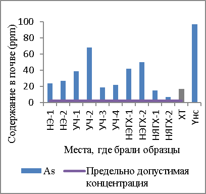 Почва ЮКНЯ 2 находится под большим влиянием мышьяка, а другие образцы подвергаются опасному воздействию мышьяка. Образцы УЧ-1, 3, 4 имеют среднее влияние загрязняющих факторов черным свинцом. Образцы УЧ-2, 3, 4, а также образец НЭ-2 имеют среднее влияние загрязняющих факторов цинком, остальные образцы имеют незначительное влияние, а некоторые образцы – не имеют влияния загрязняющих факторов. Образцы УЧ-2 и ЮКНЯ-2 имеют среднее влияние загрязнения никелем, а некоторые образцы – не имеют влияния загрязняющих факторов. Влияние загрязняющих факторов хромом и кадмием во всех образцах ниже или отсутствуют (Таблица 10).