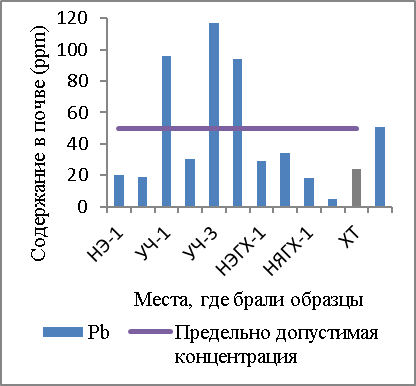 Если рассмотреть с точки зрения степени загрязнения тяжелыми металлами, то почва УЧ-2 загрязнена в очень большой степени, почвы НЭ-2, УЧ-1, ЮКНЭ-1, 2 загрязнены в просто большой степени, почвы НЭ-1, УЧ-3, 4 загрязнены в средней степени. А почвы ЮКНЯ 1,2 имеют небольшое загрязнение тяжелыми металлами. (Таблица 7, Рисунок 14).