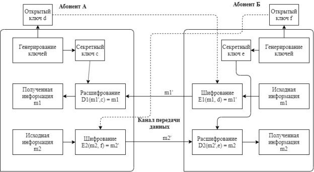 Имеется два абонента — А и Б. Абонент А имеет открытый ключ d, который является открытой информацией и секретный ключ c, значение которого известно одному лишь абоненту А. Абонент Б так же имеет пару ключей: открытый ключ f и секретный ключ e.