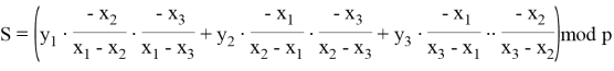 Пусть известны первые три доли секрета. Для восстановления значения секретного ключа рассчитаем интерполяционный полином Лагранжа, используя следующие формулы: